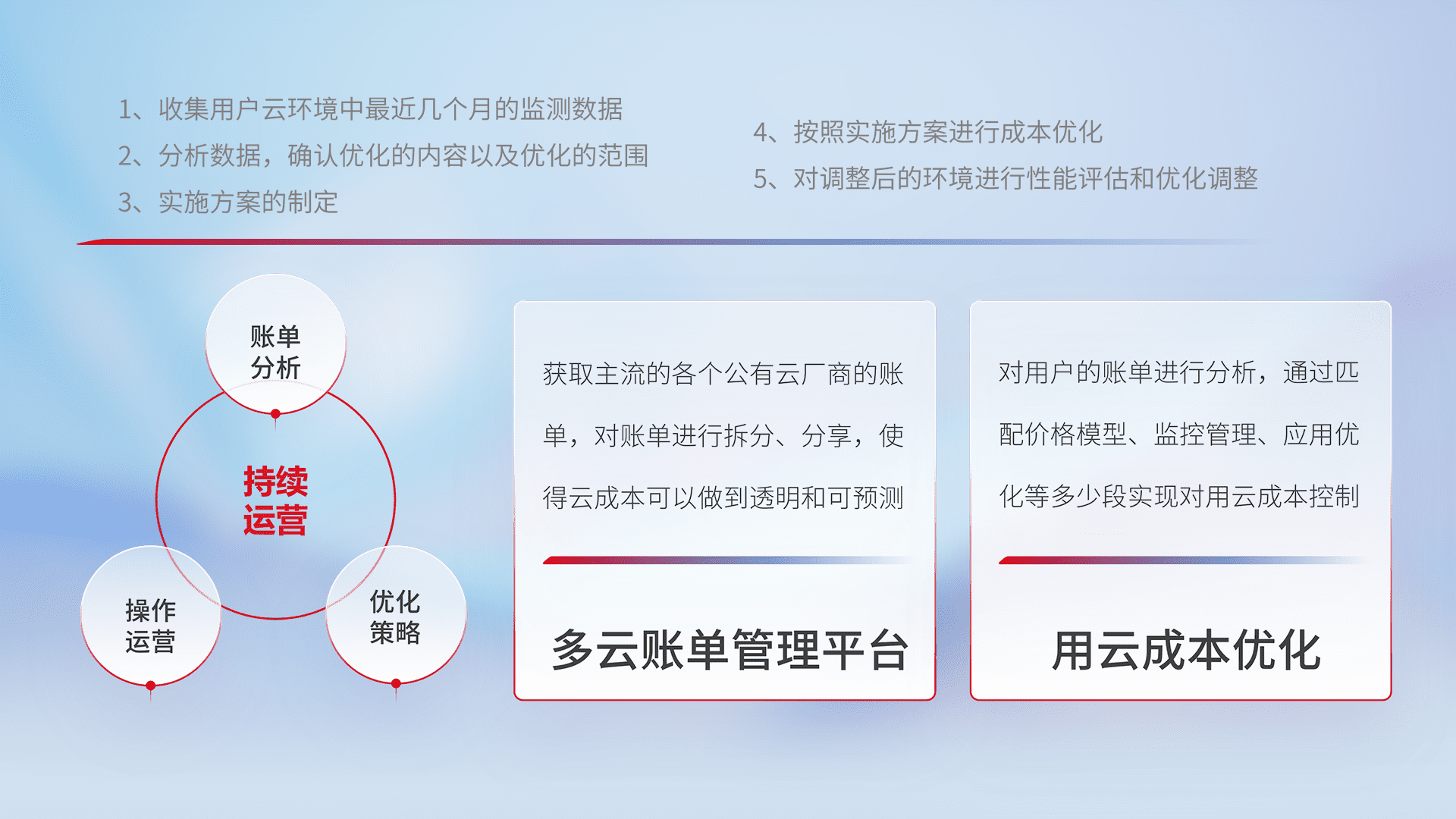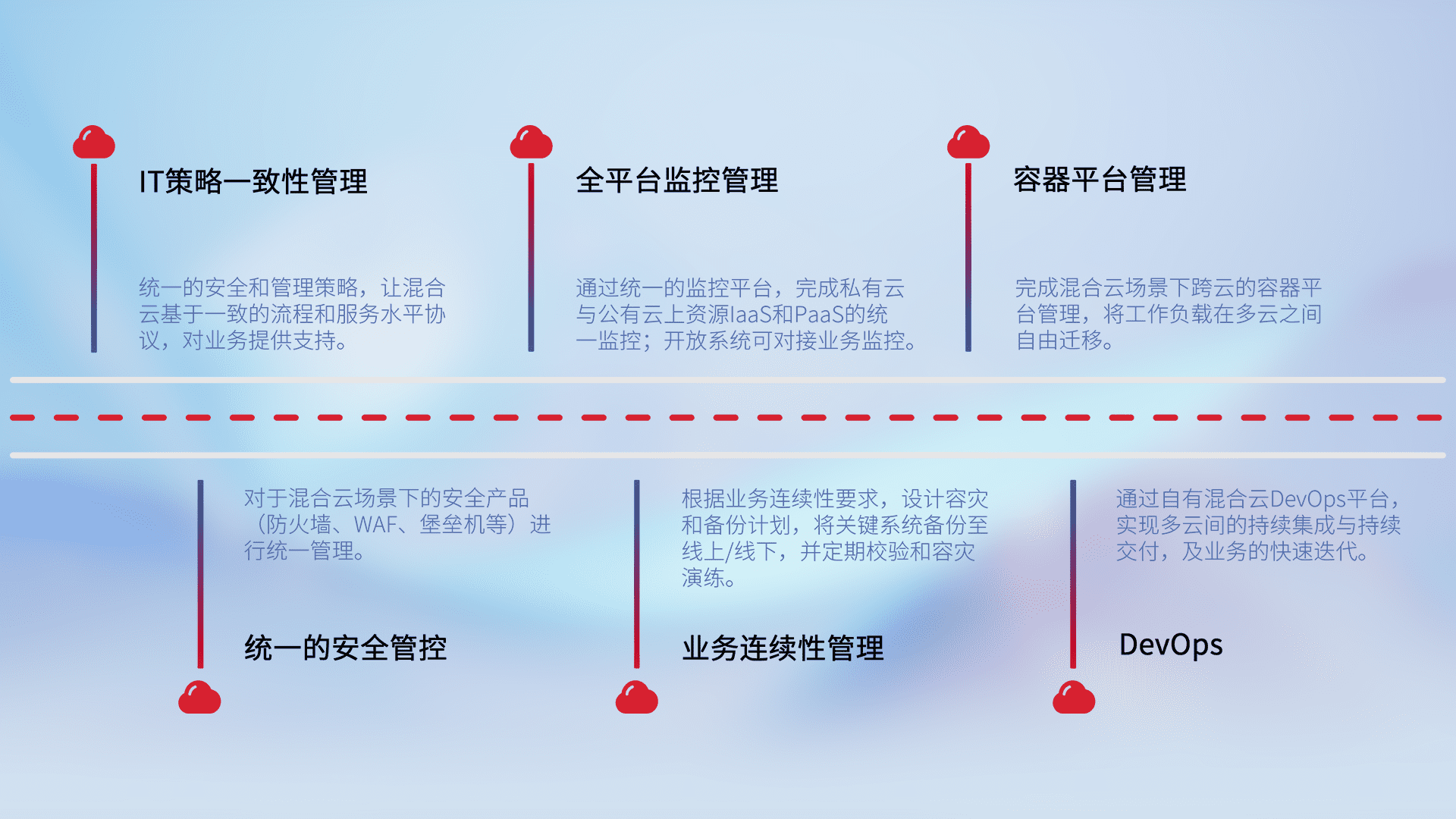 通过多云纳管,,,,以统一的资源数据模型把客户的云资源进行抽象和封装,,,进而实现对多云资源的统一操作,,,保障云资源管理的可靠性、、、稳定性与可用性。。。。量身定制化运维内容,,,,配置、、、、开发运维、、、补丁管理、、、备份、、监控、、、认证和访问管理、、、、审计和日常巡检等,,,保障在用云过程中的可靠度,,,稳定度以及高可用率。。