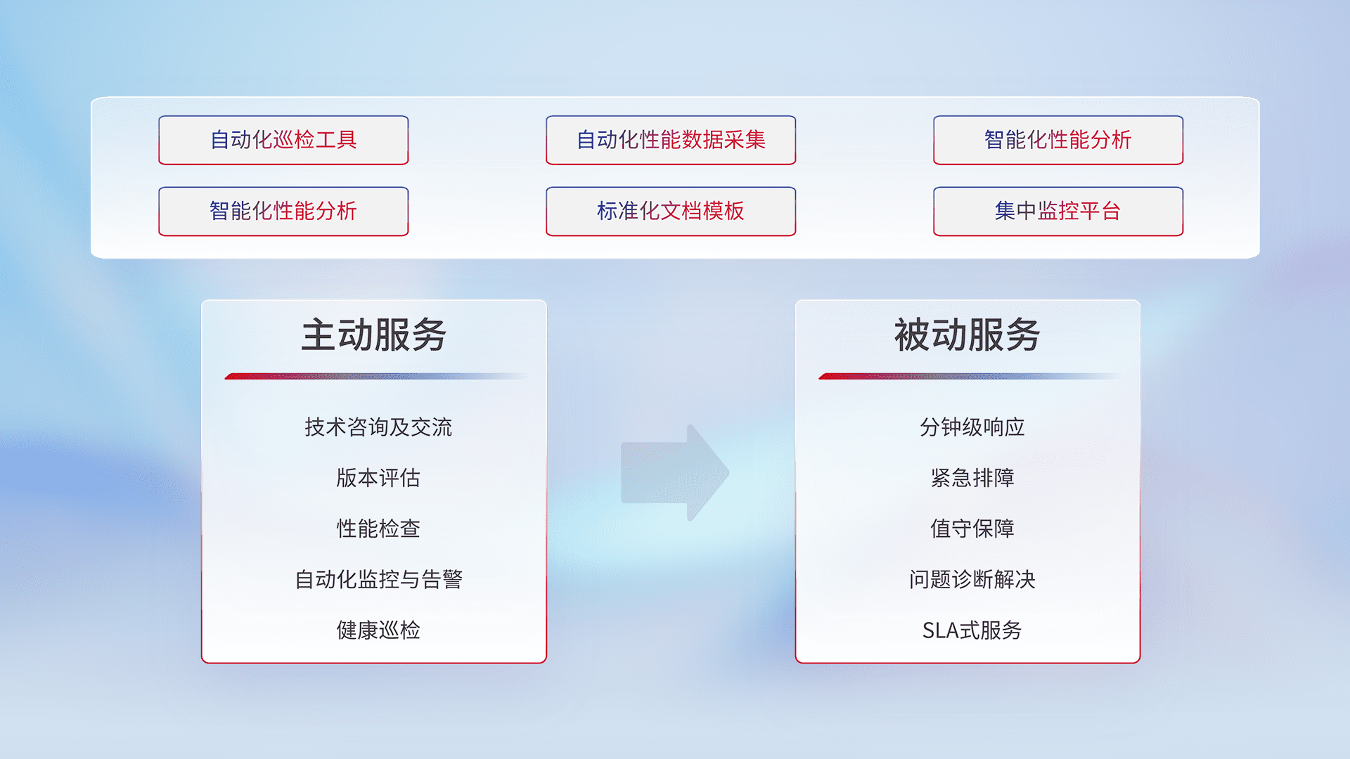 智能化工具和标准化文档,,,保障服务质量,,,,提供主动服务(包含技术咨询、、、版本评估、、、、性能检查、、、自动化监控与告警、、、健康巡检)和被动服务包含(分钟级响应、、紧急排障、、值守保障、、问题诊断解决、、SLA服务)。。