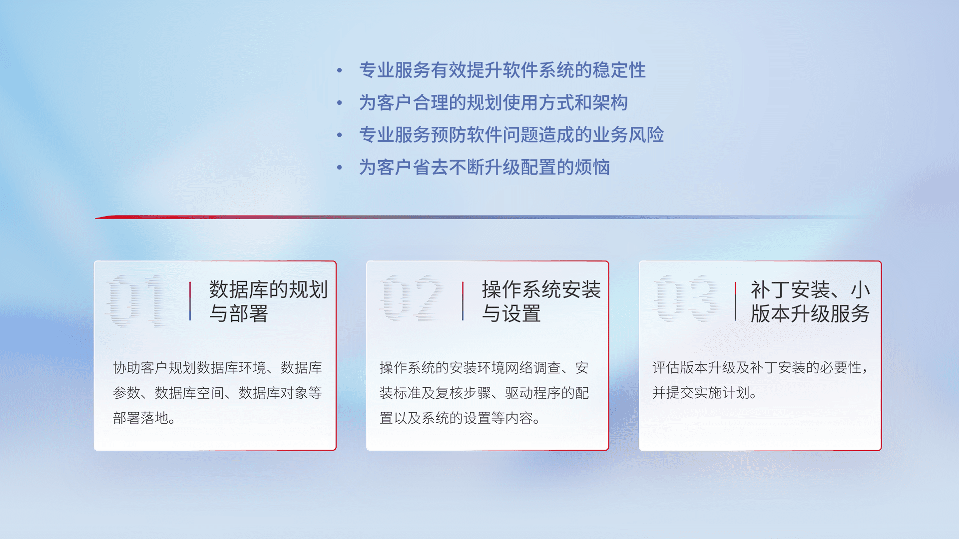 为客户提供软件规模升级、、、、快速部署、、、、按需配置的专业服务,,,从数据库的规划与部署到操作系统的安装与设置,,,,再到补丁安装和小版本升级提供支持。。。。
